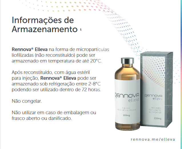 Rennova® Elleva é composto por micropartículas liofilizadas de Ácido Poli-L-Láctico (PLLA) envasadas à vácuo, que proporciona reconstituição rápida e homogênea. Contém 210mg de Ácido Poli-L-Láctico (PLLA) que representa 40% a mais do ativo em comparação com o produto comercializado no mercado.